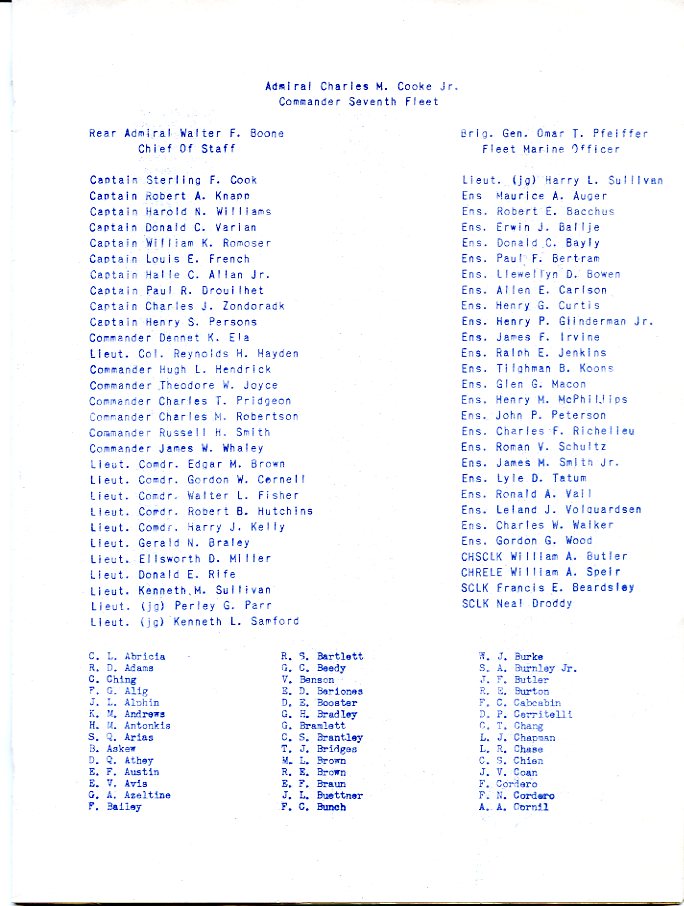 I remember at one time we had 2 admirals and 23 captains aboard after the 7th fleet flag came aboard. The uniform of the day was undressed blues or whites.. We arrived in Shanghai in November of 45 and I departed the ship July of 46. During that time we made only one trip to Northern China so except for that trip we were tied up at Shanghai .