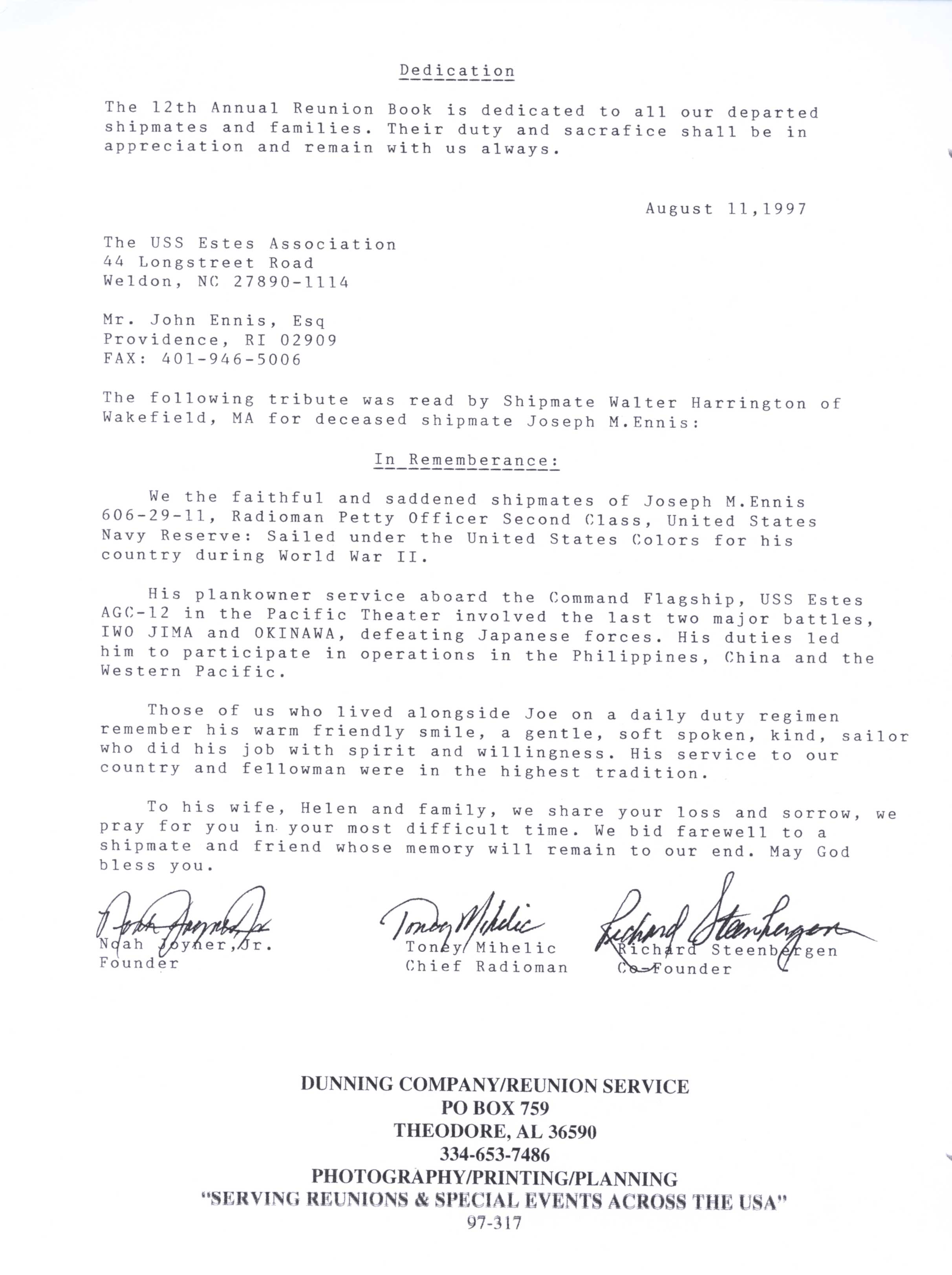 U.S.S Estes AGC-12 11th Annual Reunion 53rd Anniversary October 8 - 13, 1997 Biloxi Beach Resort Inn Biloxi, Mississippi