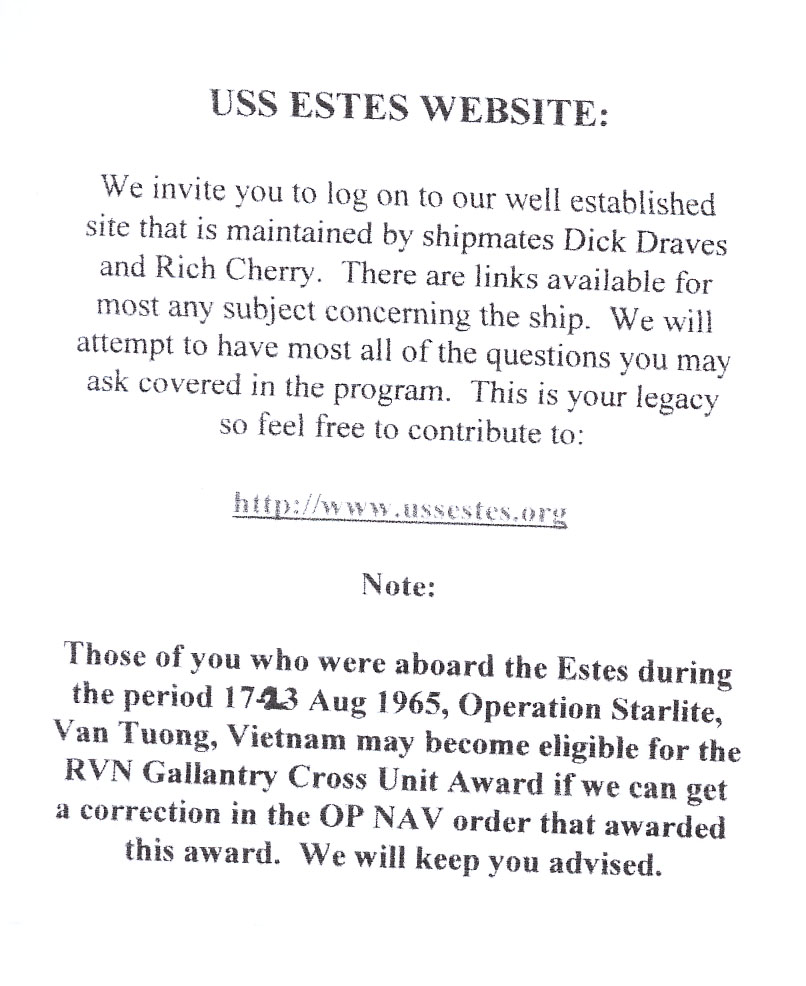 We believe this reunion to be one of the best. It was well attended this year and our expectations were fulfilled with attendance of nine (9) new members and their spouses. We solicited the Branson Hospitality Group to arrange and conduct our reunion giving everyone an opportunity to enjoy the program. Our hospitality room was one of the best, separate and on site with plenty of room for our memoribilia. The Branson Windmill Inn furnished our rooms and an adequate continental breakfast each day. The Reunion Schedule listed elsewhere in this report will give you our complete list of activities. The Pizza Party on the first evening was canceled due to excellent and adequate food provided during the welcome reception. On the morning of our second daywe were treated to a show at the Welk Theater, by the Lowe Family of Utah. A very talented and well presented musical show by the entire family. Our attendance as the "USS Estes of WWII, Korea and Vietnam Era" was recognized. Later in the day a visit and tour of the Veterans Memorial Museum was a memorable part of the day. In addition to all the items used during all these conflicts, the names of those killed are recorded on the wall as the form of a wall covering. There on the wall under WWII is the name of Pharmacist Mate 1st Class Helvey. The first casulty at Iwo Jima, buried at sea from the USS Estes. Later that evening we sailed again aboard the paddle-wheeler Branson Belle for dinner and a very entertaining show. Prior to boarding we were treated to a time for reflection and thanks for all those who ever served on the Estes in her twenty-five year reign. A secluded quiet area was provided to remember those departed ones with remarks by reunion planner Noah Joyner and Chaplain Dick Steenbergen followed by the playing of "TAPS." On Saturday morning our annual business meeting was attended by the entire group. No one volunteered to take the reins for 2007. The executive and administrative structure of the organization will remain the same by member agreement. A reunion site for 2007 was put on the floor, none volunteered by the members. Noah Joyner placed in nomination the Northern Kentucky Reunion & Convention site, area of Cincinnati, OH on the Ohio river. Those present agreed and indicated they would try to attend in 2007. Group photos were taken later in the evening, three poses, one pose as a gift from Branson Hospitality. Our final event was the Dinner Banquet at the hotel. The menu was a choice of Prime Rib, Chicken, or Vegetarian. The ladies were all presented and wore a floral corsage courtesy the Estes Association. After dinner there were remarks by anyone wishing to speak and we had a few. The Estes Association wishes to thank everyone and we hope to see you next year |