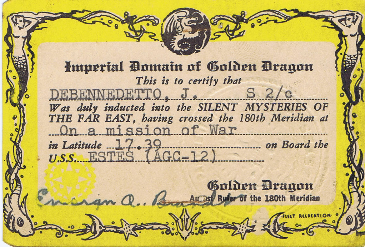 I would like to submit the following information on behalf of my father, who is now deceased. Dennis, Joseph Julian, WO-1, aboard 1944-1945, present for actions at Iwo Jima and Okinawa. My father has recorded his experiences aboard the USS Dixie and the USS Estes, which ships crossed paths after an accident in which Estes was damaged in the bow. Repairs were effected by the crew of his former ship, the Dixie. My father is now deceased (Feb 2000).