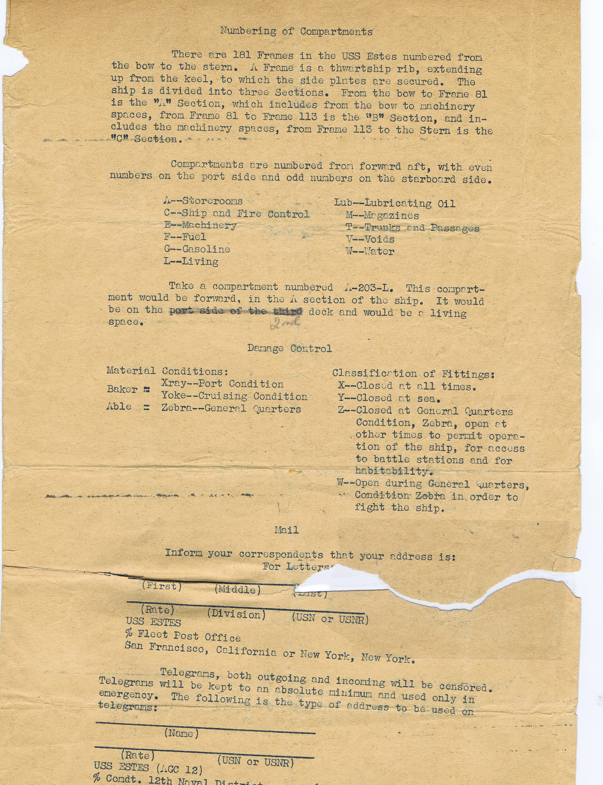 I have pictures of my dad in uniform, several pictures of the crew and a "Commemorating First Anniversary" USS ESTES AGC-12) program, which you already have on your web site. I'll attempt to send you what I have. I have my father's dog tags, which read "WILLIAM FRANK JR. BANFIELD 898-51-58 T5/44TYPEA USNR-SV P". My father was born 01/25/07 in Sayre, PA and passed away 02/21/91 in San Antonio, TX.