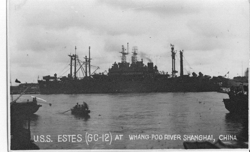 I came across your USS Estes website today. My father, Allen Poehler, was a young officer on the Estes at the end of WWII. He was in charge of photography, among other things. I am sending you pictures of the day when Chiang Kai-shek visited the ship, as Lewis Heaverlo mentions on your site. I hope you all enjoy these. My dad spoke of this several times and was very proud of his service in the Navy.