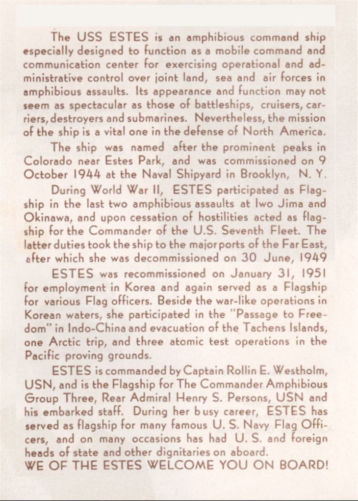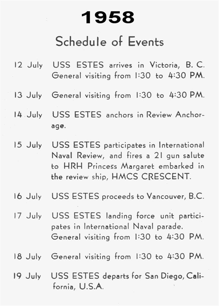 Sgt Robert A. Doerring USMC. I served on the USS Estes AGC-12 from Jan-57 to Jan-59. I was a member of the USMC Communications Detachment. I am curious as to anyone who might have been on board in August of 1958 when we made the trip to Vancouver for the Centenial celebration of the Province of Britich Columbia.Submitted by Charles A. Austin