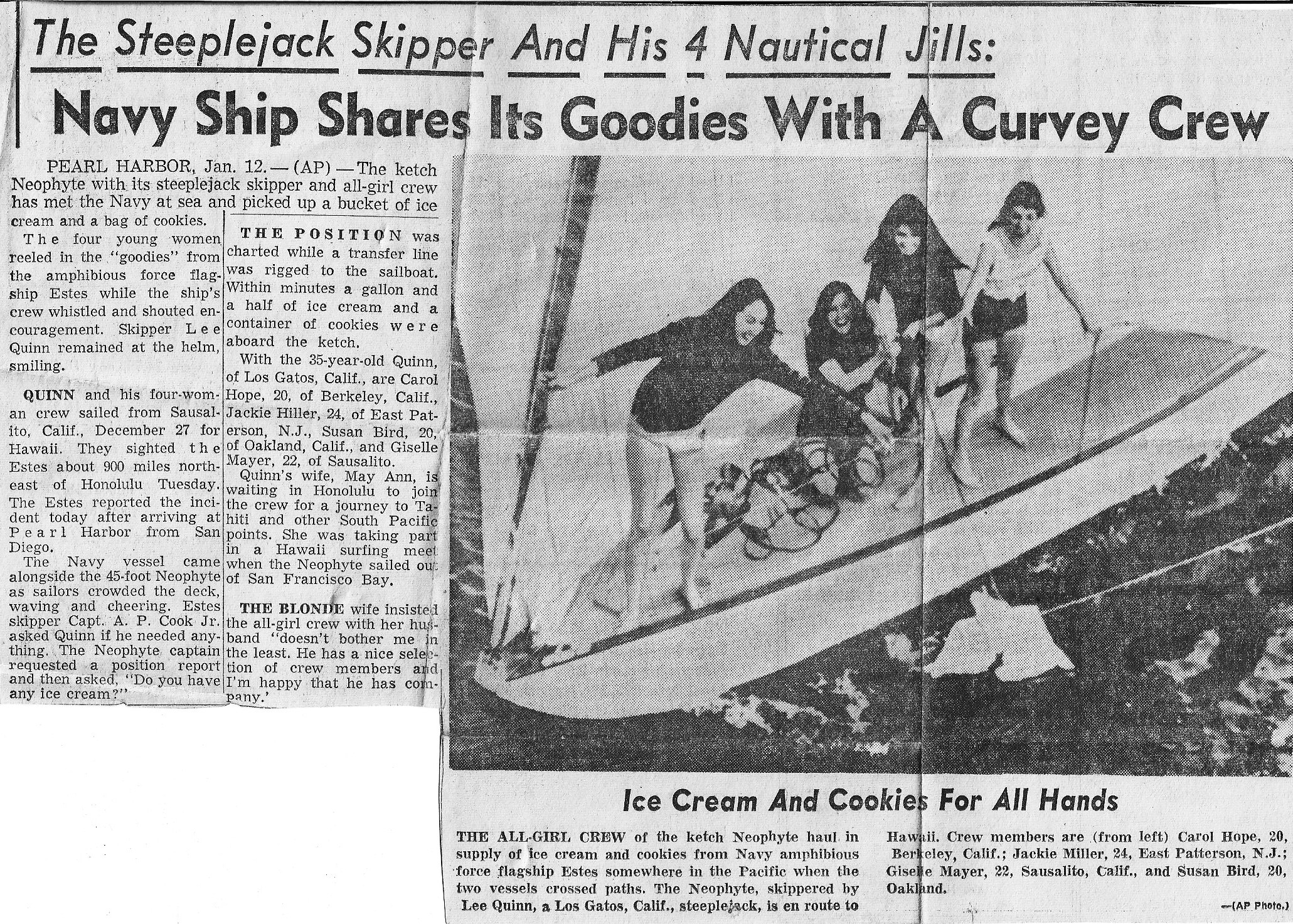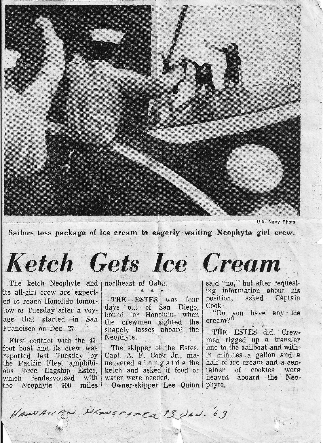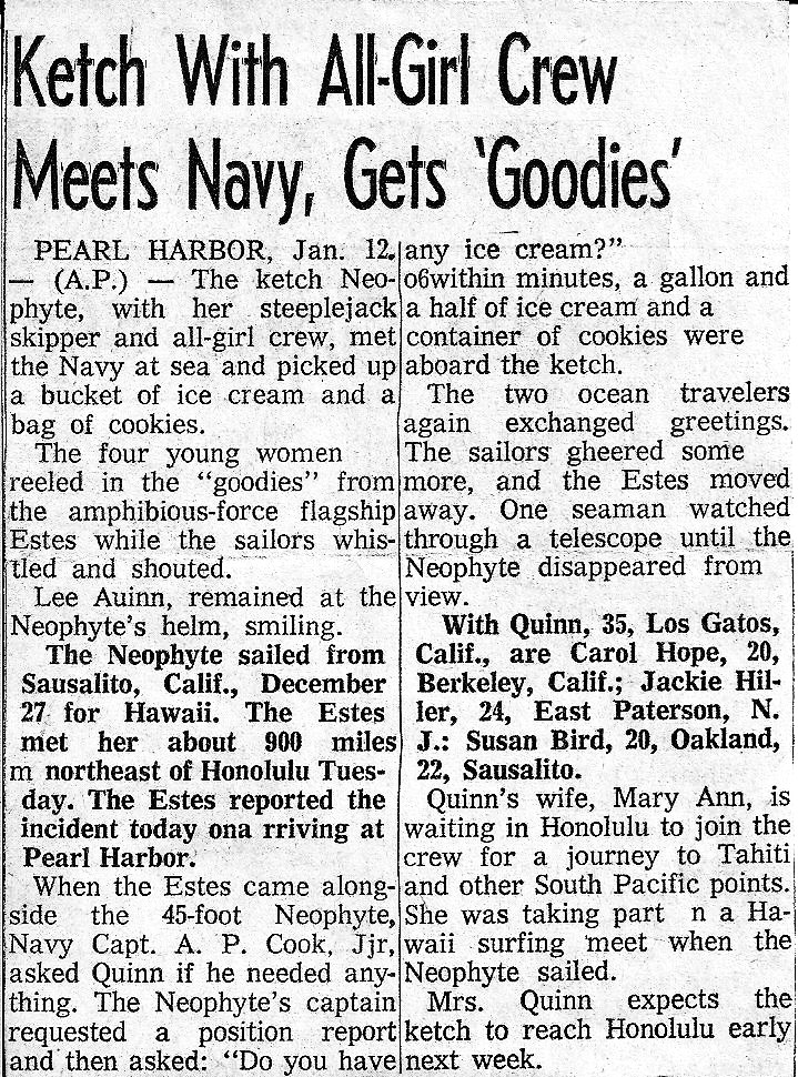 On our way to Pearl Harbor, I remember coming up on a Sailboat with Lee Quinn and his all girl crew. I thought the ship was going to capsize when a female crewmember of Quinn's asked "Is there anything we can do for you?". That would have been a good time for one to abandon ship - just a few days from Hawaii and to be rescued by an all girl crew of a small sailboat. Wish I had had a camera - if anyone has pictures, please share them.